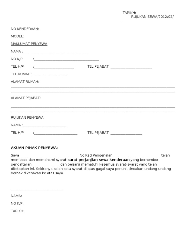 . Surat perjanjian ini adalah sebagai dokumen. Bagi mereka yang mempunyai kenderaan dan ingin menyewakan kereta tersebut kepada orang lain maka Surat Perjanjian Sewa Kenderaan perlu disediakan terlebih dahulu sebelum kenderaan tersebut diserahkan kepada penyewa kereta. Surat kebenaran bawa kenderaan 1.